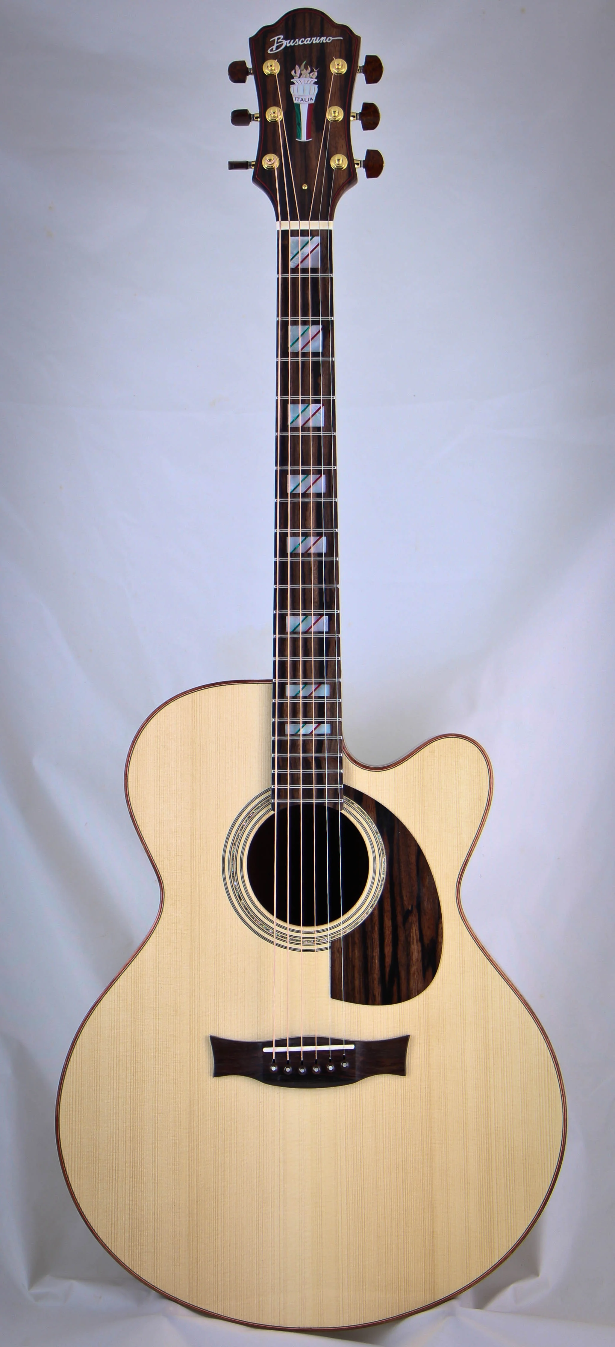 One of my favorite things as a custom guitar builder is creating one of a kind instruments. When deciding on my next project it occured to me one day that it would be cool to build a guitar that was an ode to the country of my heritage and so the rhapsody italia was born. the fingerboard and headstock inlays are malachite, mother of pearl and red coral to IMITATE the colors of the italian flag. I also used Green and red dyed pear wood with maple in the middle for the purfling on the body binding to add to the flag color scheme. the”piece de resistance” however, is the hand carved side port in the shape of a SILHOUETTE of italy itself. THis guitar is the perfect blend of old world heritage and new world design. The back is solid honduras rosewood which is carved and arched giving the guitar a more balanced tonal dynamic with an enhanced MID RANGE that is missing from most flat tops and also helps project the sound better which results in greater volume and an enhanced tone. the top is a stellar piece of carpathian spruce that give the trebels that bell like quality and adds incredible sustain. The unslotted pin bridge affords a better anchoring of the string to the bridge plate which makes for a more solid and accurate tuning. Great for single line jazz, finger style or flat picking the italia has its own unique voice and is as incredible to look at as it is to play.